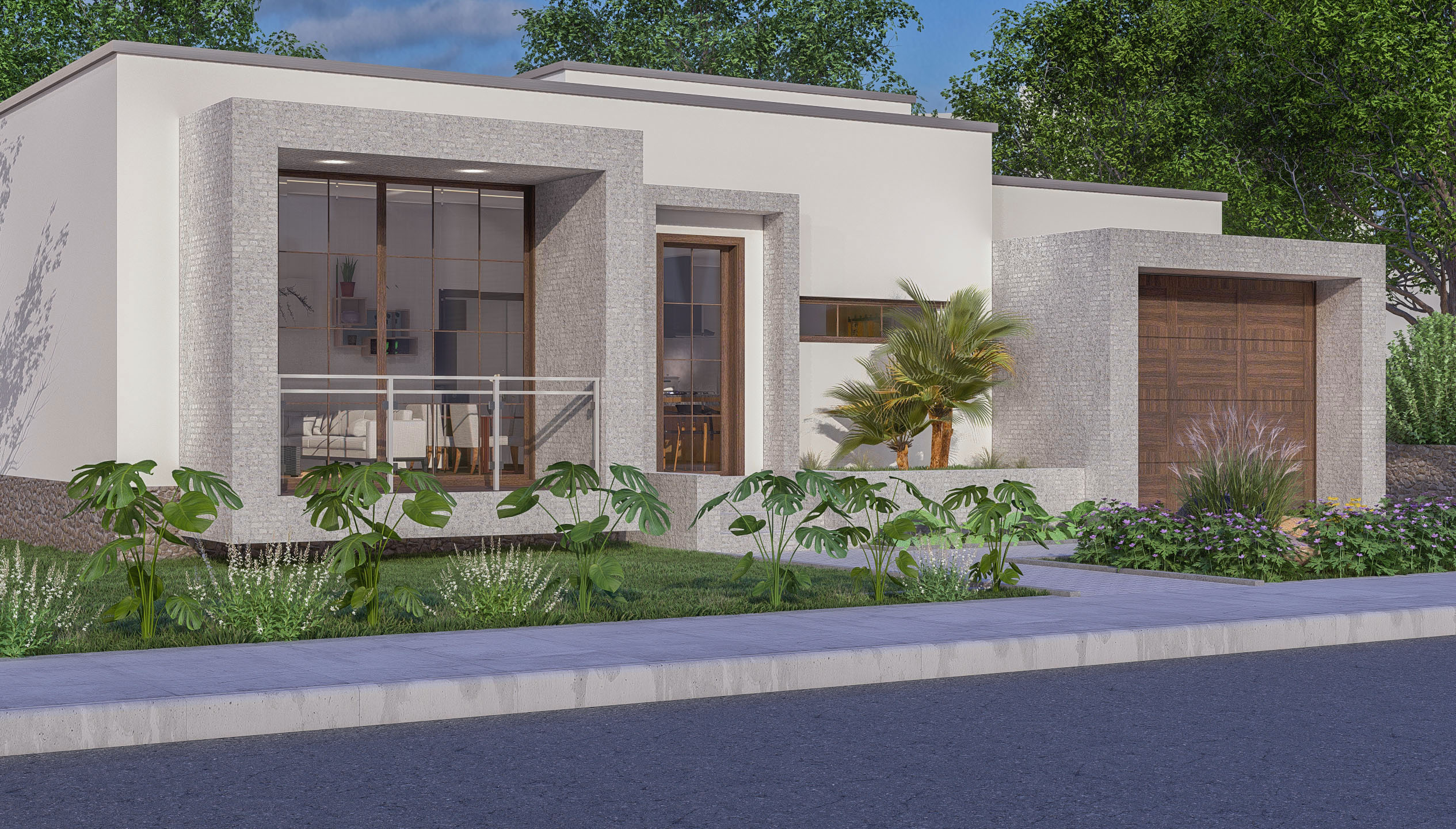 Casa pequena e moderna com dois quartos, uma sala comúm, garage, uma cozinha em ilha e uma varanda acolhedora.