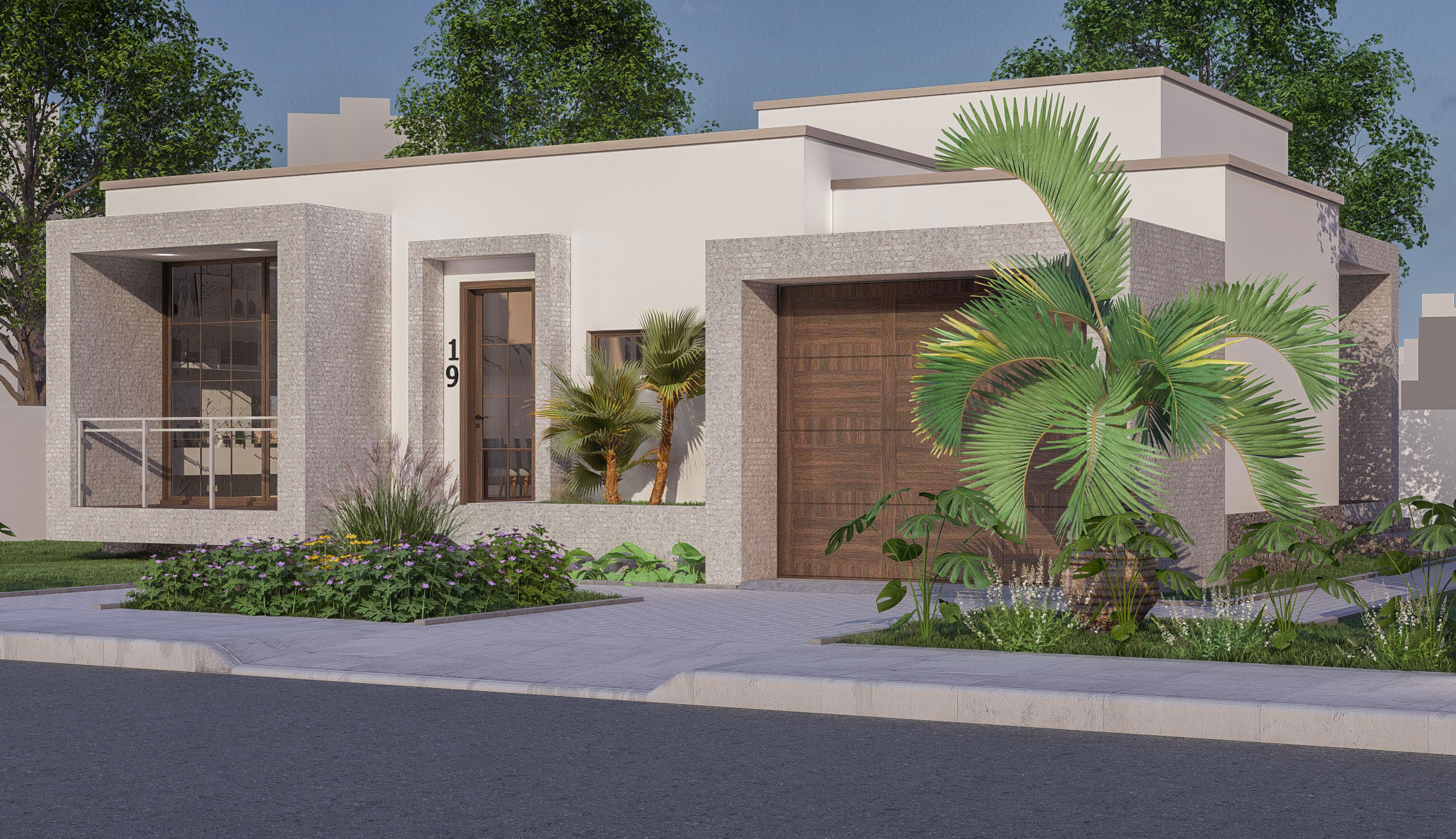 Casa pequena e moderna com dois quartos, uma sala comúm, garage, uma cozinha em ilha e uma varanda acolhedora.